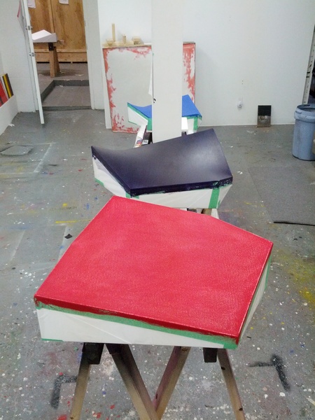 The Torqued Series started in 1998 with the introduction of the ‘Torqued Paintings’. This was an investigation into the basic principles of painting – line, shape, colour and form – through the use of custom-built stretcher frames that ‘torque’ the painting surface. In recent developments to this series the wooden frame has been constructed with no perpendicular sides to create a new and dynamic shape with resulting torqued surface. This abstract frame leads the painting series through explorations of colour, size and materials to continually push the work forward.