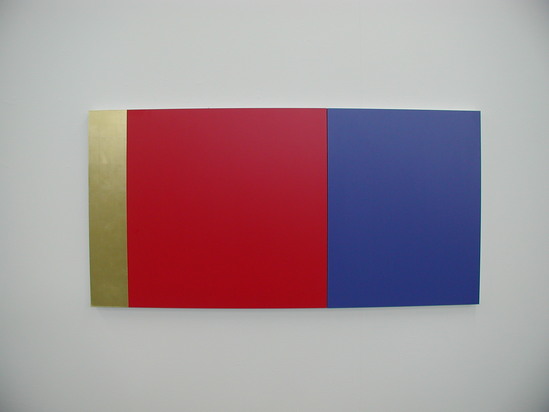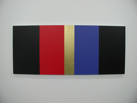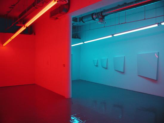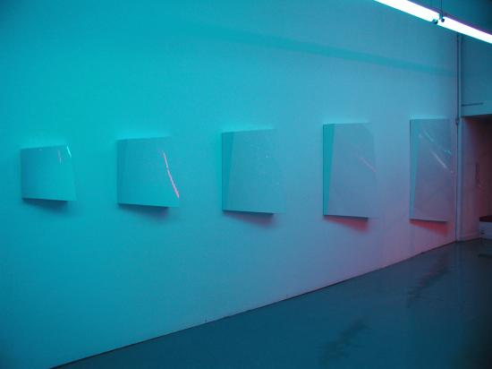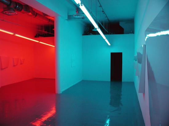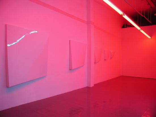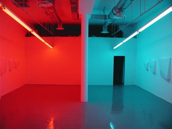 Essentially the gallery is split into two zones with the use of coloured fluorescent lighting. Each zone contains the divided sections of a large singular “painting” hung alternately on opposite walls. This installation is an exploration into the basics of design where balance, rhythm, repetition, colour, line and form create an overall emotional and aesthetic perceptual effect within differing zones of colour.