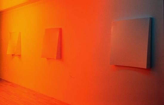 The main objective of the exhibition is to explore the idea of ‘total space’ within the gallery setting. The notion of ‘total space’ has developed out of a growing interest in architecture and design and the technical and aesthetic considerations involved. Thus all the elements within the particular space are of equal importance to each other; the paintings, the lighting and the resulting light all create an atmosphere of totality.